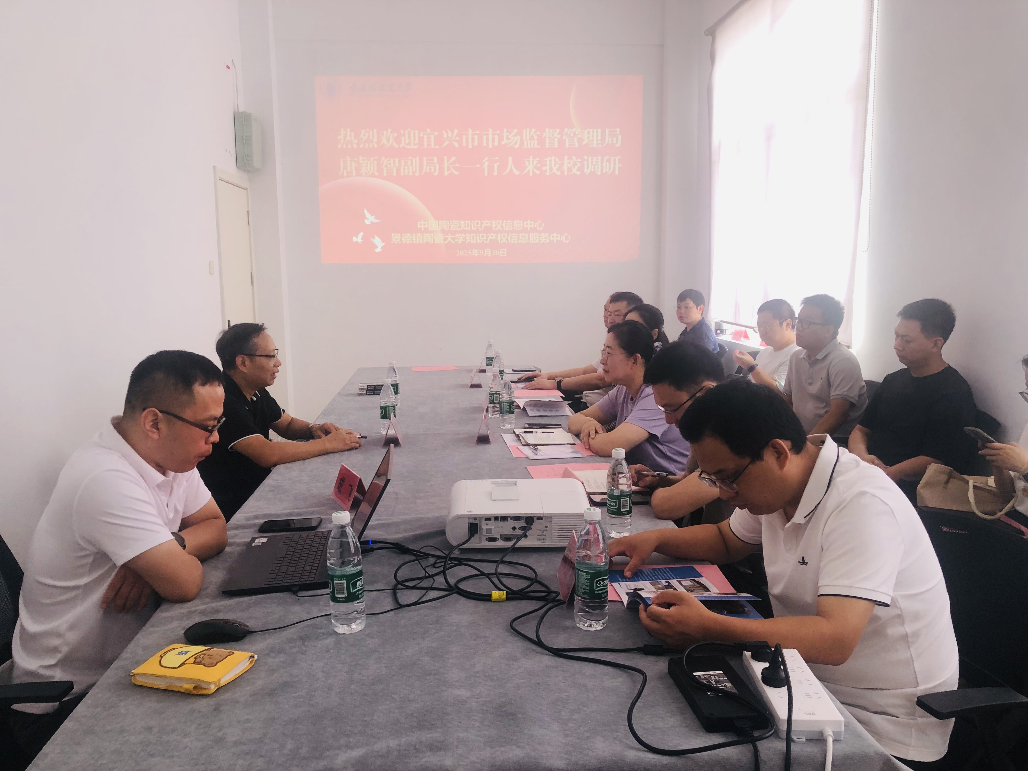 (文图/周婧)9月30日上午,宜兴市市场监督管理局副局长、党组成员唐颖智一行13人来景德镇陶瓷大学知识产权信息服务中心,围绕陶瓷专利转化运用、高校专利转化机制、陶瓷知识产权维权实践以及陶瓷行业高价值专利培育等内容开展调研交流,并共同签署《战略合作框架协议》。调研会议由原景德镇陶瓷大学知识产权信息服务中心主任、图书情报(专利分析方向)专业硕士点导师鄢春根教授主持。