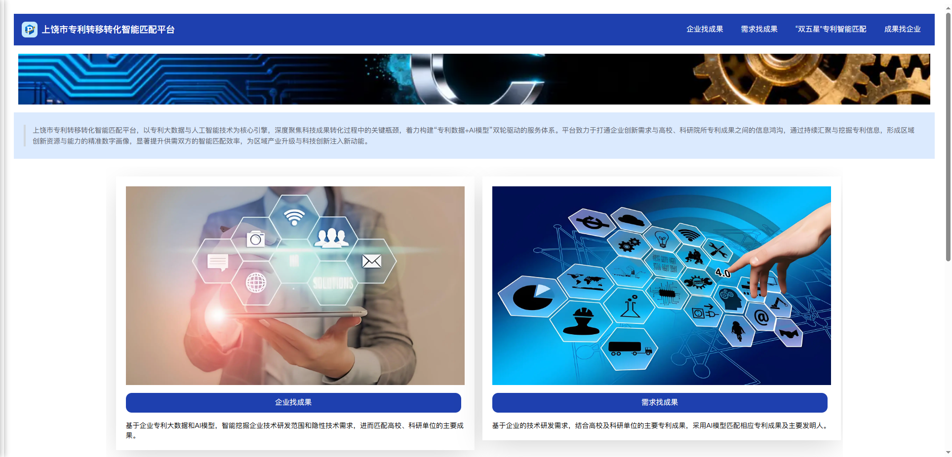 项目通过大语言模型和智能匹配算法,深度解析企业技术需求,与全国高等院校及科研机构的专利数据进行智能匹配,并与江西省“双五星”专利实现数据贯通,为上饶市重点产业提供了高效的技术对接服务,为专利转化的精准度提高和成功率提升提供技术支撑。